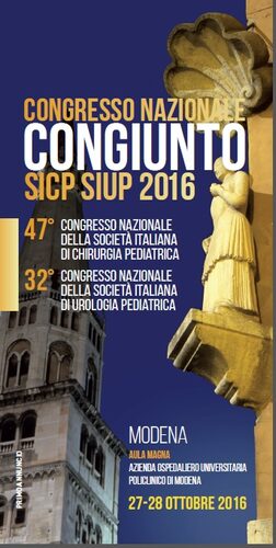 In data 27 e 28 ottobre 2016 si terrà a Modena il Congresso Nazionale Congiunto della Società Italiana di Chirurgia Pediatrica (SICP) e della Società Italiana di Urologia Pediatrica (SIUP): si tratta del più importante evento scientifico nazionale delle discipline elencate, con una nutrita partecipazione internazionale (EU, USA, Canada) sia a livello di Relatori che di Partecipanti.