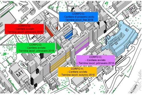 Gli interventi, oggetto di un unico appalto integrato suddiviso in cinque lotti, riguardano le aree appartenenti ai corpi G (piani 2,3,4,5), E (piani seminterrato, rialzato, 1,2,3,4,5), C (piani seminterrato, rialzato, 1,5), D (piani rialzato, 1,2,3,4,5), H (piani 1,3,5).